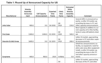 据悉,目前已经有晶科能源、First solar、Hanwha Q-cells、Sunpreme、LG solar、特斯拉等制造商公布了其扩产公告。如果当前公告能够按期全部实现,则将为美国增加4.2GW左右的组件产能和1.7GW左右的电池(包括薄膜)产能。