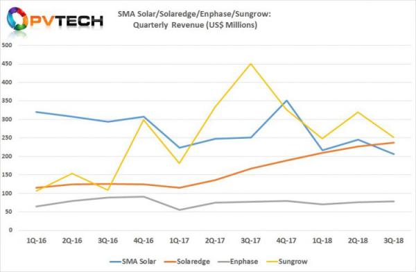 令人担忧的是,SMA的市场份额也在逐步被竞争对手吞没。SolarEdge Technologies近两年来保持了良好的收入增长,同时保持了高毛利率和强劲的盈利能力,SolarEdge在2018年第三季度的季度营收数据上首次超过SMA Solar,SMA Solar已经失去了SolarEdge Technologies等竞争对手的市场份额。