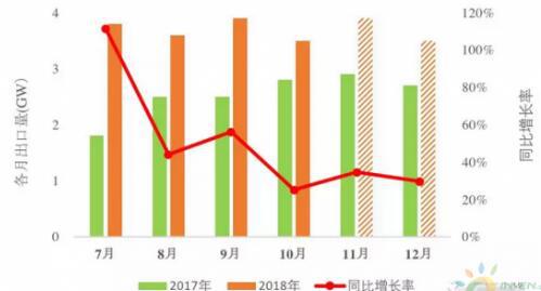 2017年下半年,由于美国201法案的影响,出口量猛增,导致三季度的组件价格不降反升。然而,2018年下半年出口表现更加喜人,出口同比增长约为45%,每季度的出口量高达11GW!