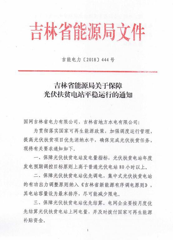 12月18日,吉林省能源局发布《关于保障光伏扶贫电站平稳运行的通知》,《通知》指出,保障光伏扶贫电站发电量指标,年度发电预期调控目标原则上高于普通光伏电站80小时以上,保障光伏扶贫电站优先调电和结算。