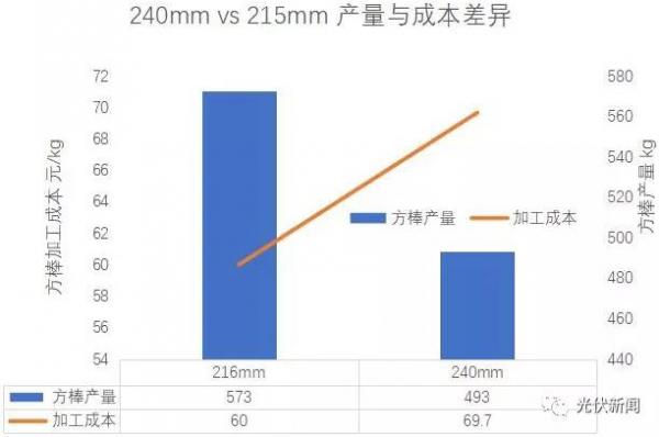 显然,240mm单晶方棒的加工成本高出近10元/公斤,产出量减少约15%。