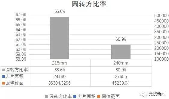 相比于215mm圆棒开157对边宽的硅片,240mm开方成166的利用率明显低很多。简单的几何题,稍微对比可以看出: