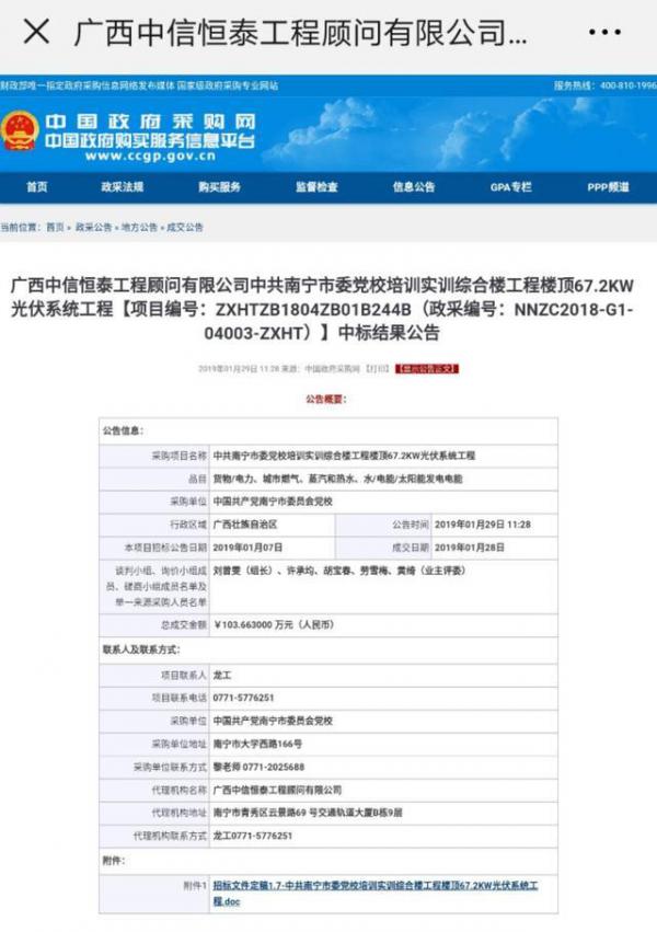 中国政府采购网了解到一则中标公告,中共南宁市委党校培训实训综合楼工程楼顶67.2KW光伏系统工程最终总成交金额:103.663万元(人民币),折合: