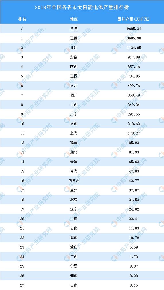 2018年全国各省市太阳能电池产量排行榜(附完整榜单)