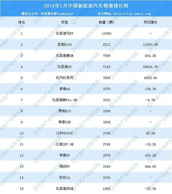 2019年1月,新能源乘用车销量第一的车型为比亚迪元EV,销量达10093辆。前十排名车型依次为比亚迪元EV、宝骏E100、比亚迪唐DM、比亚迪e5、北汽EU系列、奇瑞eQ、比亚迪秦ProDM、荣威Ei5、帝豪GSE、江铃E200S。其中,比亚迪e5、宝骏E100、北汽EU系列等车型同比涨幅超100%。