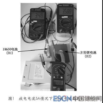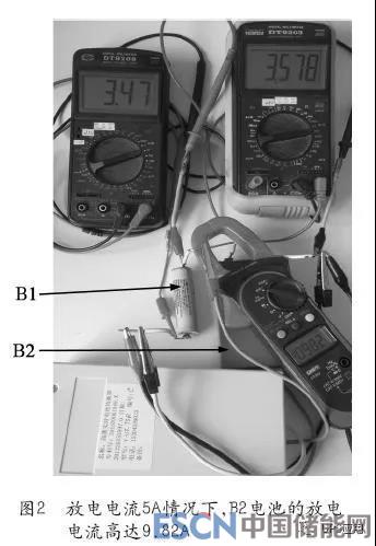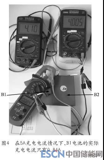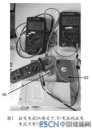 图1所示的为实验装置电池组,18650电池(B1电池)的容量只有1Ah,蓝色方形电池(B2电池)的容量高达11Ah,容量差高达10Ah,相差10倍,当前总放电电流5A,钳形电流表下面的装置是本文所述高效大功率均衡器样机,采用的是独创的“双向同步整流技术”(见附件“影响电池均衡电流和均衡效率的瓶颈及解决方案——双向同步整流技术”),在均衡器的介入下,均衡电流则高达9.08A(存在测量误差,下同),如图1所示;方形锂电池的实际放电电流高达9.82A,如图2所示;而18650电池的实际放电电流只有0.87A,如图3所示,在强大均衡电流的作用下,最大电压差只有0.11V,至放电结束,两块电池的电量全部放完,并且18650电池的放电电压仍在安全电压值以内。