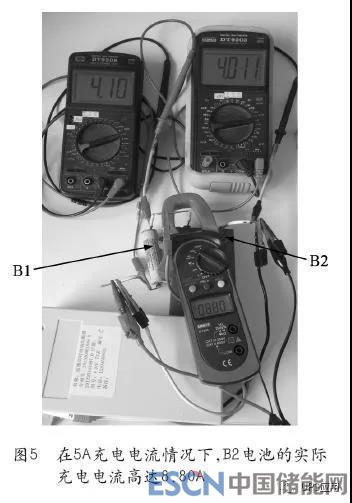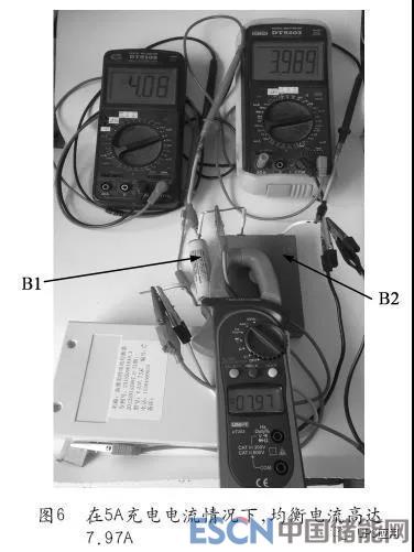 这种电池均衡技术,不仅支持高速放电均衡,而且支持高速充电均衡,仍以上述电池组为例,同样以5A恒流充电至自动切换恒压充电期间,本应通过B1电池的的5A电流,实测最大充电电流只有0.84A左右,如图4所示;而B2电池的实测充电电流高达8.8A左右,如图5所示;最大均衡电流实测高达7.97A左右,这一数值正好接近于两块电池的实际充电电流的差值,如图6所示。