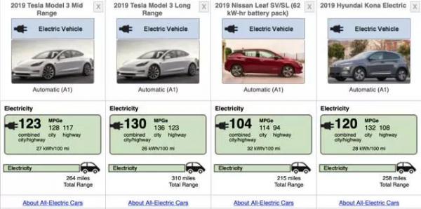 举例来说,3.5万美元的Model 3使用的是50kWh电池,续航里程达到220英里。62kWh日产(OTCPK:NSANY) LEAF也有类似的续航能力,但电池容量要大24%。人们已经怀疑,特斯拉在电池技术方面拥有最大的成本优势,这给了该公司很大的定价权。毕竟,3.5万美元的Model 3比远距离的日产聆风(Nissan LEAF)更实惠,而且大多数人都认为这是一款更高级的汽车。以下是Model 3中长线、日产LEAF SV/SL和现代科纳电气的燃油效率数据: