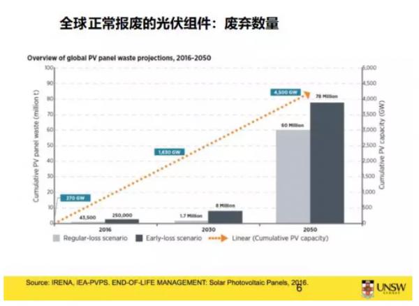 可能很难想象,全世界各国政府,光伏制造商们以及光伏发电的业主们到2050年,可能需要面对将近7800万吨报废的晶硅组件,假设一片组件的重量是18Kg,这就意味着有差不多43亿块电池板需要处理。风险与机遇并存:回收处理得当,获利颇丰,处理不当则会污染环境,贻害无穷。