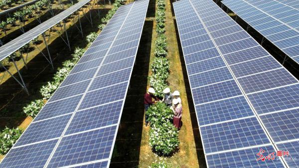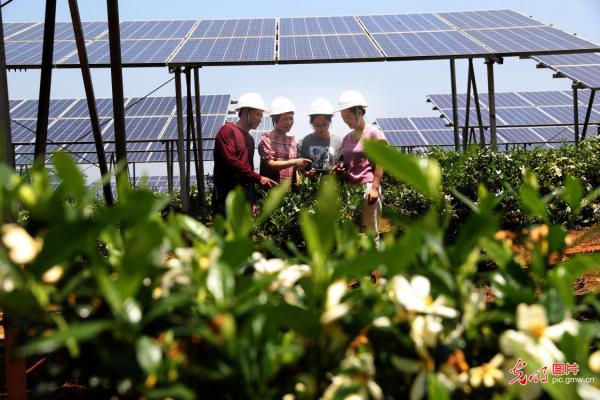 2019年5月23日,江西省抚州市东乡区马圩镇新溪村光伏大棚底下的390亩黄栀子进入开花期,该区林业局工作人员正在查看黄栀子的长势。近年来,当地依托地理优势,大力推进以"林光互补""农光互补"等多种模式的光伏项目建设,实行顶上光照发电,棚下空间种植林果等,在扮靓荒山荒坡的同时,有效地发挥了土地的最大效益。