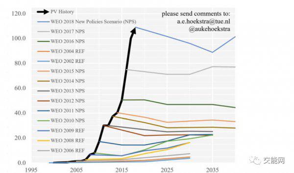 一直以来,IEA对光伏装机的预测是趋于保守的,实际的增长情况超出了预期(上图黑色实线代表实际发展情况,其他为各年的预测情况)。