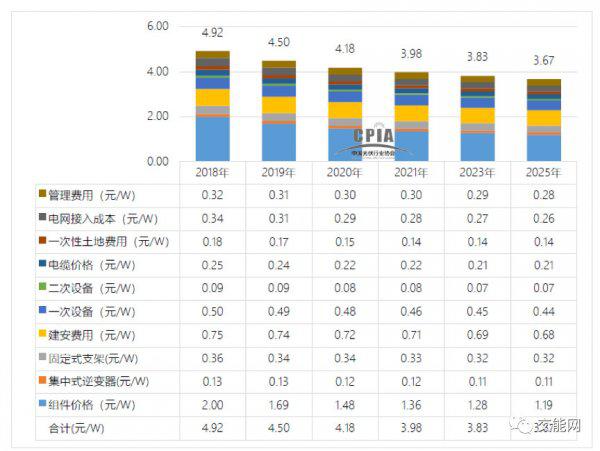 2018年,我国地面光伏系统的初始全投资成本为4.92元/W左右,较2017年下降1.83元/W。其中,组件约占投资成本的40%,非技术成本约占17%(不包含融资成本)。随着技术进步,降本增效,组件价格将持续降低,在总投资成本中的占比也将减少,其他成本虽有下降趋势但其降幅不大。预计到2019年全投资成本可下降至4.50元/W,2020年可下降至4.18元/W。