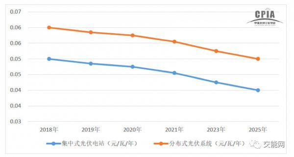 电站运维是太阳能光伏发电系统运行维护的简称,是以系统安全为基础,通过预防性维护、周期性维护以及定期的设备性能测试等手段,科学合理的对电站进行管理,以保障整个电站光伏发电系统的安全、稳定、高效运行,从而保证投资者的收益回报,也是电站交易、再融资的基础。2018年分布式光伏系统运维成本为0.06元/W/年,集中式地面电站为0.05元/W/年。预计未来几年地面光伏电站以及分布式系统的运维成本将持续保持在这个水平并略有下降。