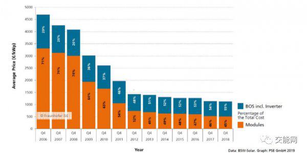 德国10~100kW的屋顶光伏建成所需的均价(橙色为组件价格)