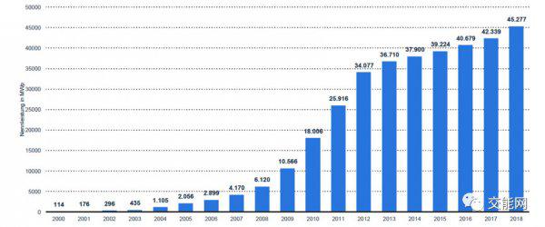 德国太阳能光伏发电装机累计容量(单位:MW)(上图中数字间“.”为千位分隔符)