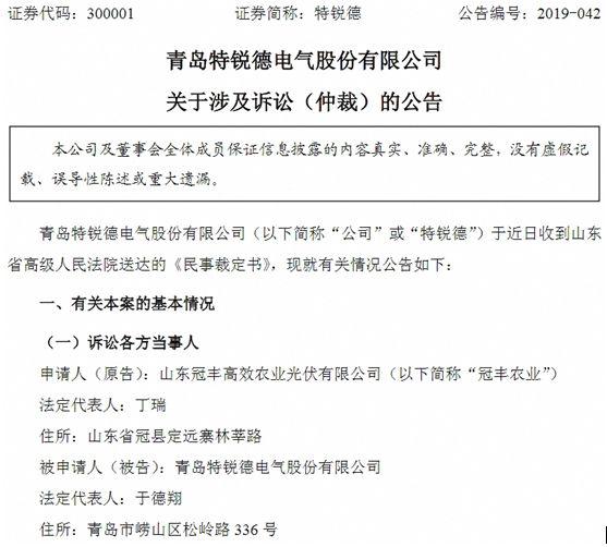 7月12日,特锐德”发布关于涉及诉讼(仲裁)的公告称,近日收到山东省高级人民法院送达的《民事裁定书》,法院裁定:“冻结被申请人特锐德的银行存款人民币35000万元或查封、扣押其相应价值的其他财产”。