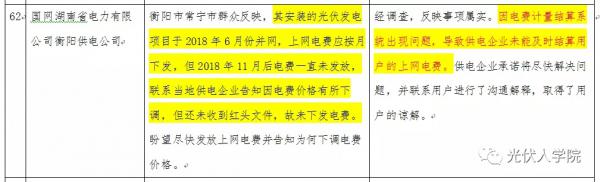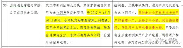 投诉问题7:安装的光伏发电项目于2018年6月份并网,上网电费应按月下发,但2018年11月后电费一直未发放,联系当地供电企业告知因电费价格有所下调,但还未收到红头文件,故未下发电费。