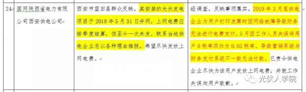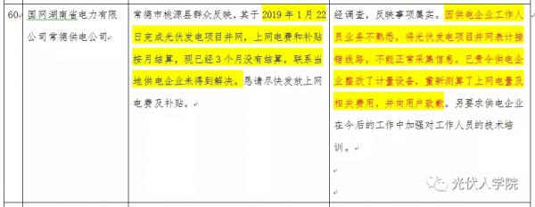 投诉问题5:2019年1月22日完成光伏发电项目并网,上网电费和补贴按月结算,现已经3个月没有结算,联系当地供电企业未得到解决。