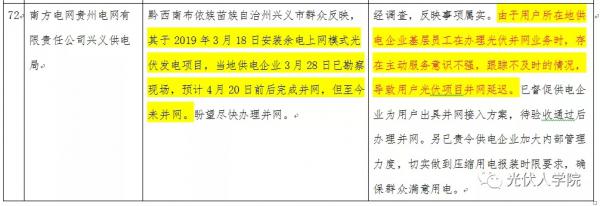 投诉问题8:2019年3月18日安装余电上网模式光伏发电项目,当地供电企业3月28日已勘察现场,预计4月20日前后完成并网,但至今未并网。