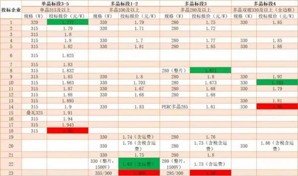 而在多晶1-2标段,最低1.63元(含运费)/W,最高1.885元/W,均价1.757元/瓦;多晶标段3最低报价1.671元/瓦,最高报价1.88元/瓦,均价1.757元/瓦;多晶标段4最低报价1.763元/瓦,最高报价1.96元/瓦,均价1.848元/瓦。