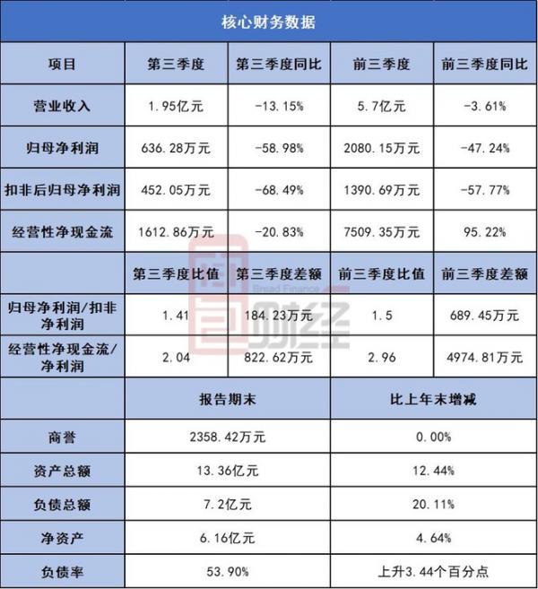 其中,第三季度营收1.95亿元,同比下降13.15%;归母净利润636.28万元,同比下降58.98%。
