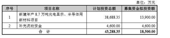 报告期内,公司完成了总额1.85亿可转换公司债券的发行。根据募集说明书,公司可转债存续期6年,采取累进利率,第一年票面利率0.4%。可转债募集资金将用于新建年产8.7万吨光电显示、半导体用新材料项目(1.39亿)和补充流动资金(4600万)。
