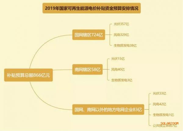 2019年6月份,国家可再生能源信息管理中心发布数据显示,2019年国家可再生能源电价补贴资金预算总额约为866亿元,具体情况情况见下图。