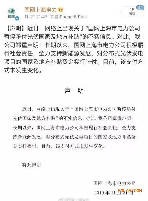 周二晚间,有媒体爆出上海市太阳能学会发布《关于组织召开“市电力公司暂停垫付光伏补贴交流会”的通知》,计划于2019年11月29日召开主题为“关于民营企业对国网上海市电力公司拟停止垫付相关补贴的意见和建议”的会议。