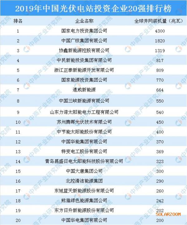 日前,由365光伏主办的“2019全球光伏20强排行榜发布会暨中国光伏企业全球市场发展论坛”在上海圆满举行。参会行业领军人物围绕着“平价上网”及“海外市场开拓”等话题进行交流探讨,为光伏行业发展建言献策。会议现场发布了“2019中国光伏电站投资企业20强排行榜”榜单。据榜单显示,国家电力投资集团公司、中国广核集团有限公司、协鑫新能源控股有限公司、中民新能投资集团有限公司、浙江正泰新能源开发有限公司、国家能源投资集团公司、通威新能源等20家企业进入榜单。其中,国家电力投资集团公司位居榜首。以下是榜单详情: