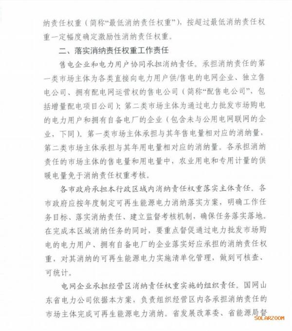 二是落实工作责任。省发展改革委、省能源局、国家能源局山东监管办督促指导第一类市场主体完成可再生能源电力消纳。各市政府承担本行政区域内消纳责任权重落实主体责任,完成本区域消纳任务的同时,负责重点督促第二类市场主体落实好应承担的消纳责任权重,对其消纳的可再生能源电力实施清单化管理,做到可核查、可统计。电网企业承担经营区消纳责任权重实施的组织责任,负责组织经营区内的市场主体完成可再生能源电力消纳。