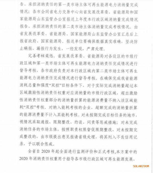 四是做好督导考核。省发展改革委、省能源局、国家能源局山东监管办对各市和第一类市场主体可再生能源电力消纳责任完成情况进行督导考核,各市政府负责对本行政区域内第二类市场主体可再生能源电力消纳责任完成情况进行督导考核。对未按期完成目标任务的地市,视情况采取通报、限期整改、约谈、问责等惩戒措施;对未完成消纳任务的市场主体,按照职责权限督促限期整改,对未按期完成整改的,由市级提出意见报请省级处理,将其列入不良信用记录,予以联合惩戒。本方案中的2020年消纳责任权重用于指导各市可再生能源发展。