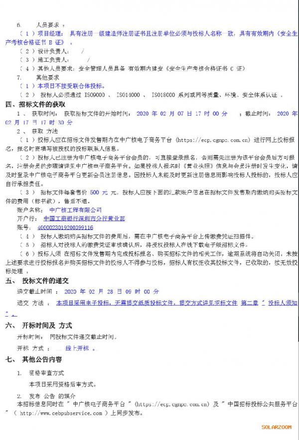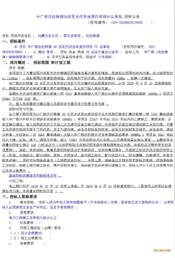 2月7日,中广核达拉特旗20兆瓦光伏发电竞价项目PC总承包招标公告发布。