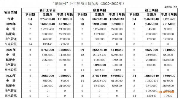列入“能源网”基础设施补短板建设三年大会战项目共44项,总投资4074亿元,三年投资2707亿元。其中电源项目20项,总投资3072亿元,三年投资1720亿元;输配电项目6项,总投资852亿元,三年投资819亿元;油气管道4项,总投资136亿元,三年投资121亿元;充电设施项目14项,总投资13.94亿元,三年投资13.94亿元。