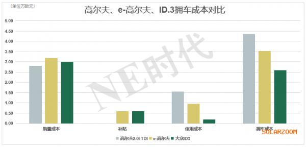 德国直接补贴后,大众e-高尔夫的售价与其燃油版新款价格相当。加上低于燃油车的使用成本,e-高尔夫的总拥车成本低于高尔夫燃油车,大众ID.3的优势更明显,在德国购置补贴和能源成本、保养成本节省下,拥车成本低于同级别燃油车的购车成本。