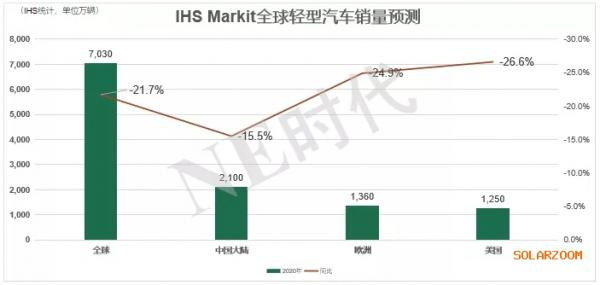 基于经济、消费力的变化,IHS Markit预测2020年全年汽车市场预期下降21.7%,其中中国大陆15.5%,欧洲24.9%,美国26.6%。