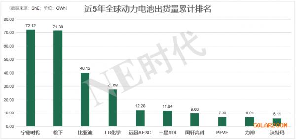 根据SNE统计的数据,过去五年里(2015至2019年),宁德时代、松下、比亚迪、LG化学和远景AESC的产品广泛应用于国际车企的车型中,全球出货量进入TOP5榜单。