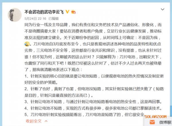 宁德称:三元和铁锂各有特点,分别满足不同的市场需求。宁德时代称:技术路线是市场和用户的共同选择。汽车应用领域广、应用场景多,对动力电池需求也是多元的。铁锂电池是我国的特色,具备高安全和长寿命的特性,是目前电动客车、物流车等商用车应用主流;三元电池能量密度高,可有效解决私家车用户的里程焦虑,成为全球新能源乘用车的主流方案。同时,钛酸锂、锰酸锂等其他技术路线也有一定应用,一些新体系电池也在研发。除此之外,疑似宁德时代工程师,微博名为“David工科男”的网友回怼比亚迪销售公司副总李云飞:没想到李总亲自进入战区,给我司工程师这么大的面子,但可以看出李总并非技术出身,短短的5句话居然出现了两个技术漏洞。