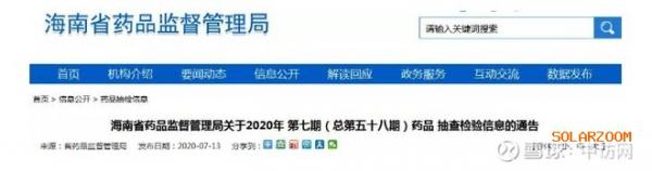 7月13日,海南省药品监督管理局发布《关于2020年第七期(总第五十八期)药品抽查检验信息的通告》。《通告》称,为加强药品质量监管,保障公众用药安全,按照2020年海南省药品抽验计划及日常监督抽样需要,我局组织对全省范围内药品生产、经营、使用单位进行了药品质量抽查检验。