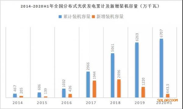 此外,分布式光伏的装机容量也在不断上升。据国家能源局数据,2014-2020年,中国分布式光伏发电累计装机容量逐年增长,且2016年以后增速明显加快。2020年1-6月,全国新增分布式光伏发电装机443.5万千瓦。截止6月底,分布式光伏发电累计装机达到6707万千瓦,占全国光伏发电装机容量的比重为31.08%。