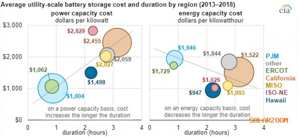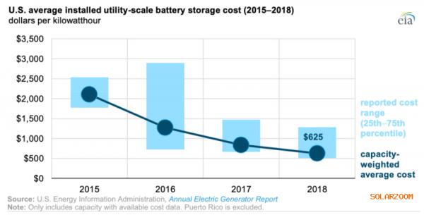 根据美国能源信息署的数据,美国公用事业规模电池存储的平均能量容量成本已从2015年的2152美元/千瓦时迅速降至2018年的625美元/千瓦时。截至2018年底,美国的电池装机功率容量为869兆瓦(电池在给定时刻所能提供的最大功率),电池能量容量为1236兆瓦时(电池可储存的总能量)。