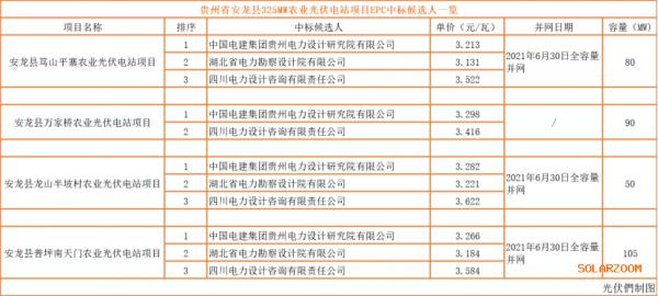 11月4-5日,贵州省安龙县四个农业光伏电站项目EPC总承包工程中标候选人公示,四个项目分别为安龙县笃山平寨农业光伏电站项目、安龙县万家桥农业光伏电站项目、安龙县龙山半坡村农业光伏电站项目、安龙县普坪南天门农业光伏电站项目;合计总容量为325MW。其中中国电建集团贵州电力设计研究院有限公司分别以3.213元/瓦、3.298元/瓦、3.282元/瓦、3.266元/瓦,位列中标候选人第一位。