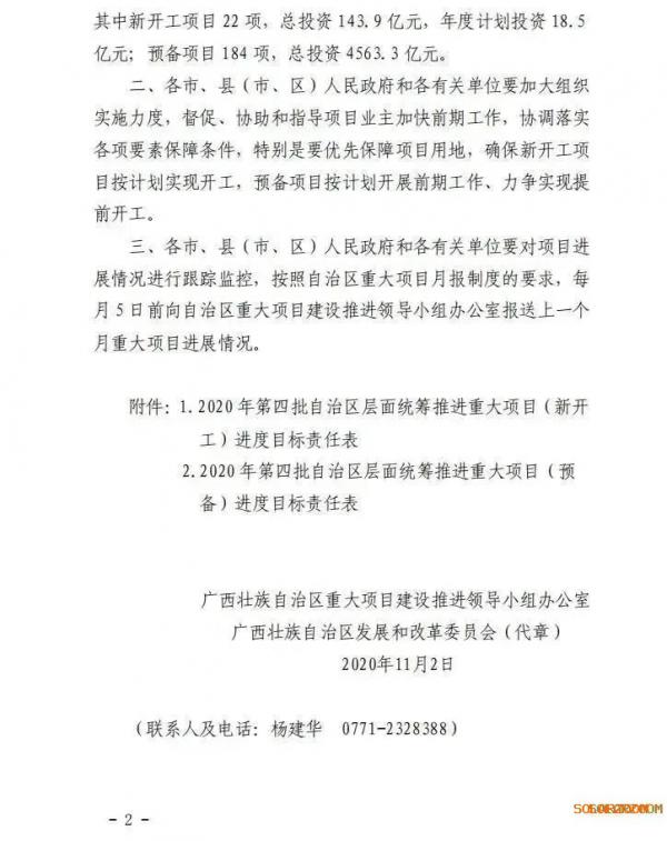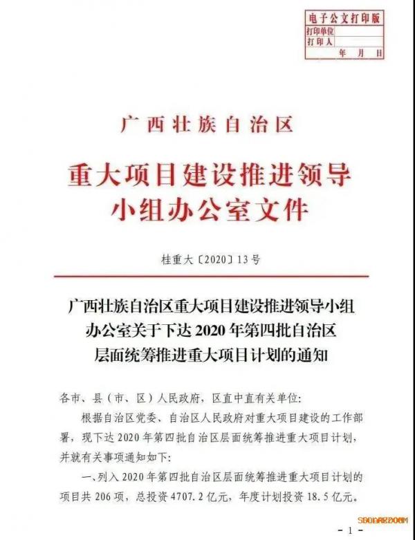 11月4日,广西壮族自治区发改委公布2020年第四批自治区层面统筹推进重大项目计划,列入2020年第四批自治区层面统筹推进重大项目计划的项目共206项,总投资4707.2亿元,年度计划投资18.5亿元。其中,新开工项目22项,总投资143.9亿元,年度计划投资18.5亿元;预备项目184项,总投资4563.3亿元。