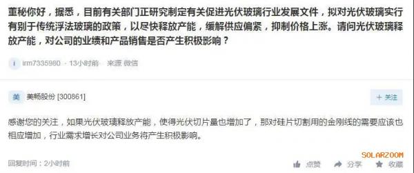美畅股份在互动平台表示,如果光伏玻璃释放产能,使得光伏切片量也增加了,那对硅片切割用的金刚线的需要应该也相应增加,行业需求增长对公司业务将产生积极影响。