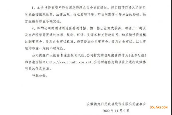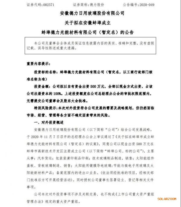 11月9日,德力股份发布公告,结合公司发展战略,于2020年11月7日召开的总经理办公会上审议通过了《关于拟在蚌埠市成立蚌埠德力光能材料有限公司(暂定名)的议案》,同意公司以现金出资500万元在蚌埠市高新技术开发区注册成立公司(以下简称“蚌埠公司、标的公司”)。