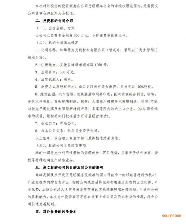 主要从事:汽车货运;包装装潢印刷品印刷;技术玻璃制品制造,销售;太阳能组件盖板、背板玻璃制造、销售;太阳能用镀膜导电玻璃;节能与微电子用玻璃及太阳能新材料产品;备案范围内的进出口业务。(依法须经批准的项目,经相关部门批准后方可开展经营活动)。同时授权公司董事长签署设立、登记等相关文件事项。