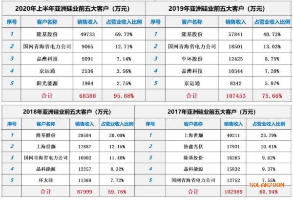 2017年-2019年及2020年上半年亚洲硅业对前五大客户销售金额合计分别为10.30亿元、8.8亿元、10.75亿元和6.84亿元,占当期营业收入的比例分别达60.94%、59.76%、75.66%和95.88%,整体上呈现持续增长趋势;
