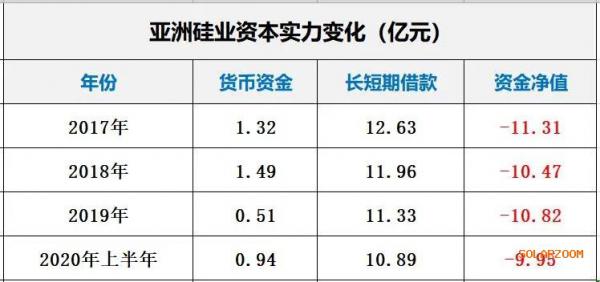 截止2020年6月末,亚洲硅业拥有的货币资金仅为0.94亿元,而长短期有息借款规模达10.89亿元,两者间存在着9.95亿元的资金缺口。