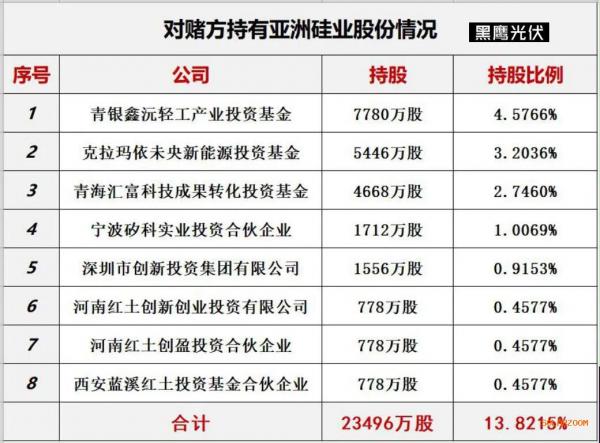 据黑鹰光伏统计,青银鑫沅、未央新能源、青海汇富、宁波矽科、西开投、深创投、红土创新、红土创盈、蓝溪红土合计持有亚洲硅业23496万股股权,持股比例为13.8215%。如此量级的股份回购,必然需要巨量资金支持。