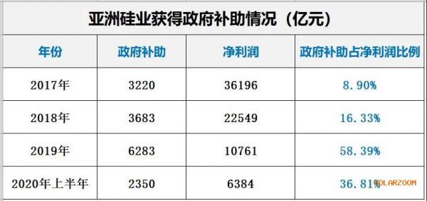 据黑鹰光伏统计,在2017年-2020年上半年间,亚洲硅业获得的政府补助金额都在2000万元以上,2019年获得政府补助6283万元,占净利润的比重达58.39%,2019年亚洲硅业“扣除非常性损益后的净利润”将降至0.47亿元,同比下降了75.82%,降幅将远大于净利润(同比下降52.28%)。