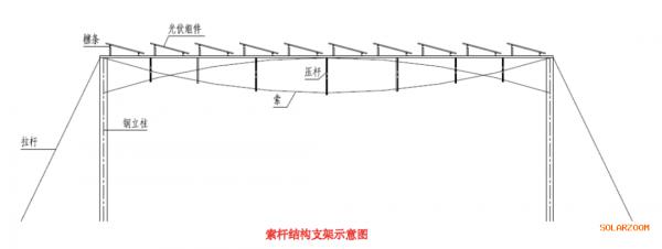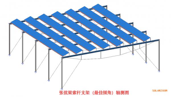 “索杆支架最开始主要利用在建筑结构里面,像浦东机场、南京奥体中心、济南高铁站等很多建筑都利用了索杆支架。索杆支架承重梁结构类似于渔腹型结构,不同承重梁之间用檩条固定成一个平面,在平面上面可以根据需要将组件布置成最佳倾角或水平布置。”中机国能浙江工程有限公司补充道,“采用索杆式光伏支架,用钢立柱立于两侧,通过索杆式桁架结构作为支承梁,通过预应力锁紧于立柱上,并在钢柱两侧端部设置拉杆,以抵抗横向水平力。考虑上方的作业面,钢柱高度取值为5m(根据项目要求),纵向柱列每40~60米左右在两柱中间设置一道剪刀撑,以抵抗纵向水平力。支承梁上部设置不等高檩条,用以固定光伏组件。整个结构形成排架式稳定结构作为光伏支架,组件按最佳倾角或者水平布置。基础采用柱下独立基础,混凝土现场浇筑。”